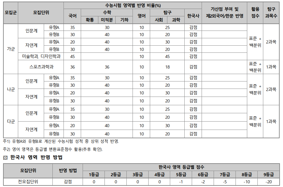 2번을 좀 살펴봅니다. 과목별 반영비를 다르게 한다는 말뜻에 대해 살펴보겠습니다. 내가 만약 문과인데, 수학을 잘 보고 국어를 못 봤을 수도 있고, 이과인데 탐구를 못 보고 국어를 잘 봤을 수도 있습니다. 이런 다양한 사연을 가진 수험생들에게 성균관대는 우리 학교로 오라고 손을 내민 것입니다. 유형 A B에 맞춰서 내 성적에 따른 맞춤형 지원을 할 수 있게 된 것이죠. 실제로 이런 방법으로 올해 수혜를 본 학생들이 굉장히 많을 것으로 예상됩니다.